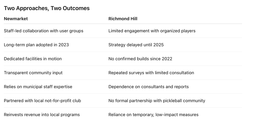 The result? Newmarket is building courts and community, while Richmond Hill is building frustration.