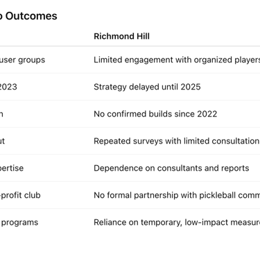 Newmarket and Richmond Hill offer a striking contrast in how cities approach pickleball growth. While Newmarket built a thriving pickleball hub through collaboration, planning, and community partnerships, Richmond Hill cancelled its 16-court facility in 2023 and delayed all progress under the guise of a combined Tennis and Pickleball Strategy. This report examines how one town moved forward—and how another chose to wait.